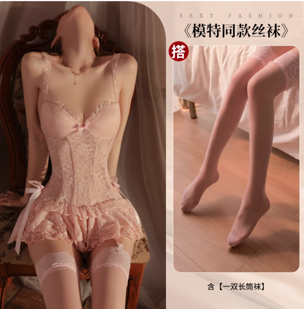 純欲粉【馬甲(含吊襪帶)+T褲+蕾絲長筒絲襪】
