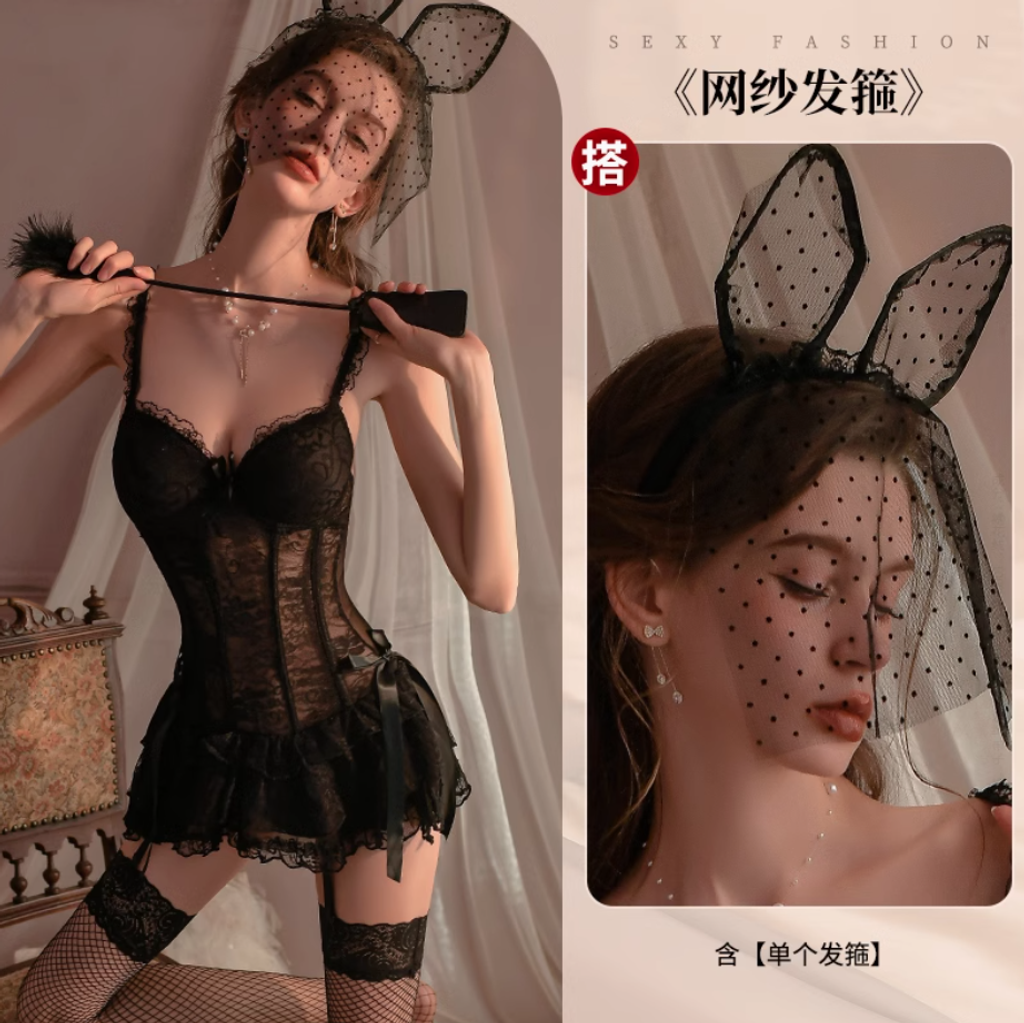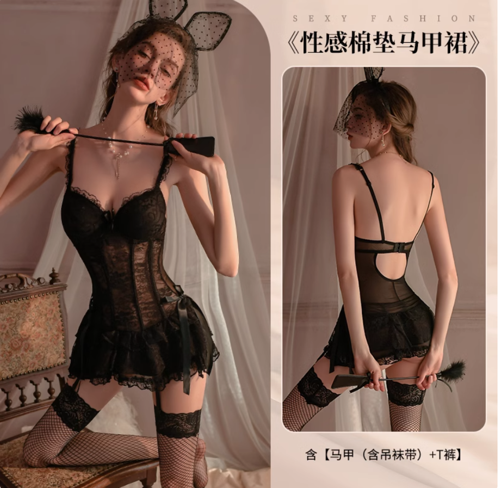 性感黑【馬甲(含吊襪帶)+T褲+網紗髮箍】