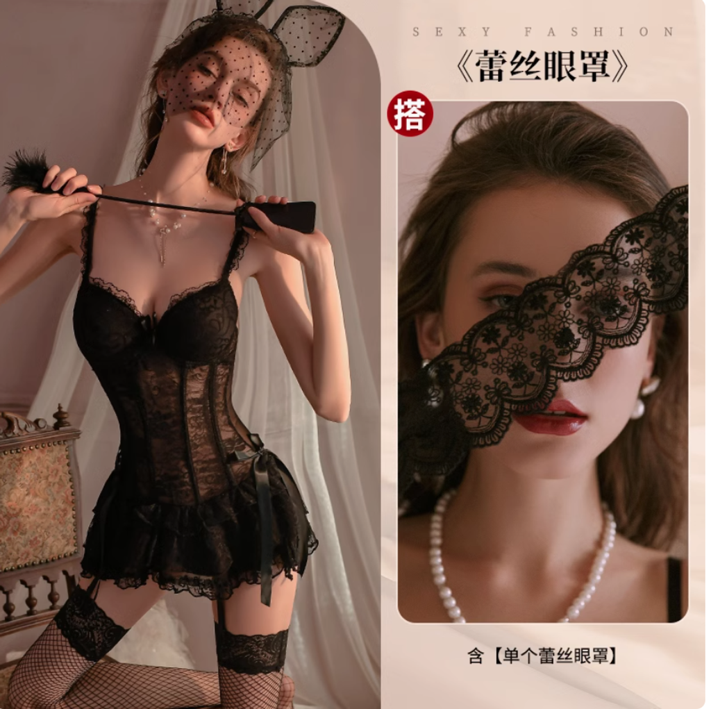 性感黑【馬甲(含吊襪帶)+T褲+蕾絲眼罩】