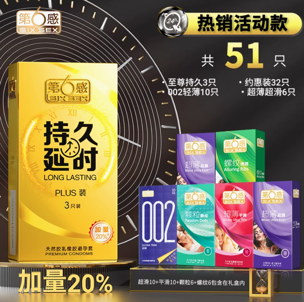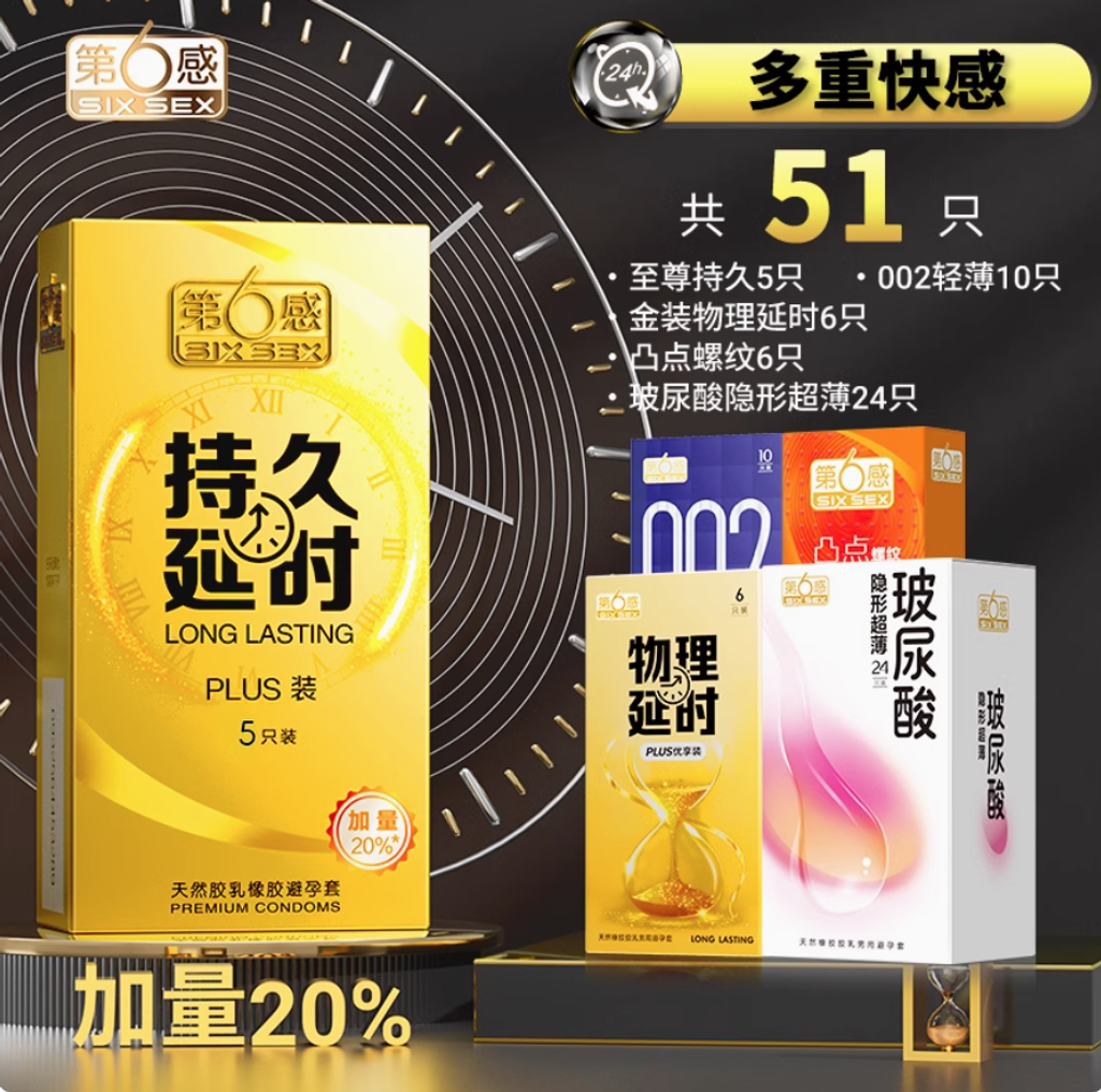多重快感【51只】至尊持久5+玻尿酸隱形超薄24只+金裝物理延時6只+002輕薄10只+凸點螺紋6