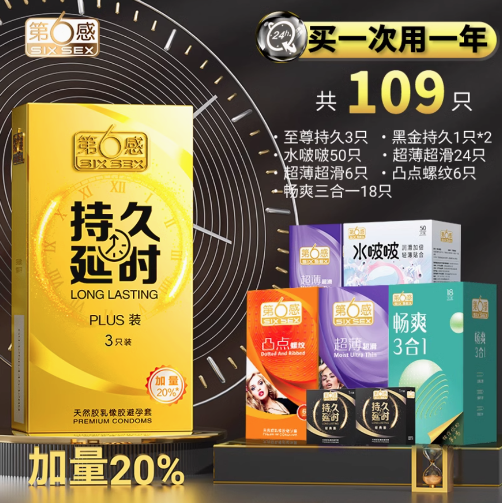 買一次用一年【109只】至尊持久3+黑金持久2+水啵啵50只+超薄超滑24只+暢爽三合一18只+超薄超滑6+凸點螺紋6