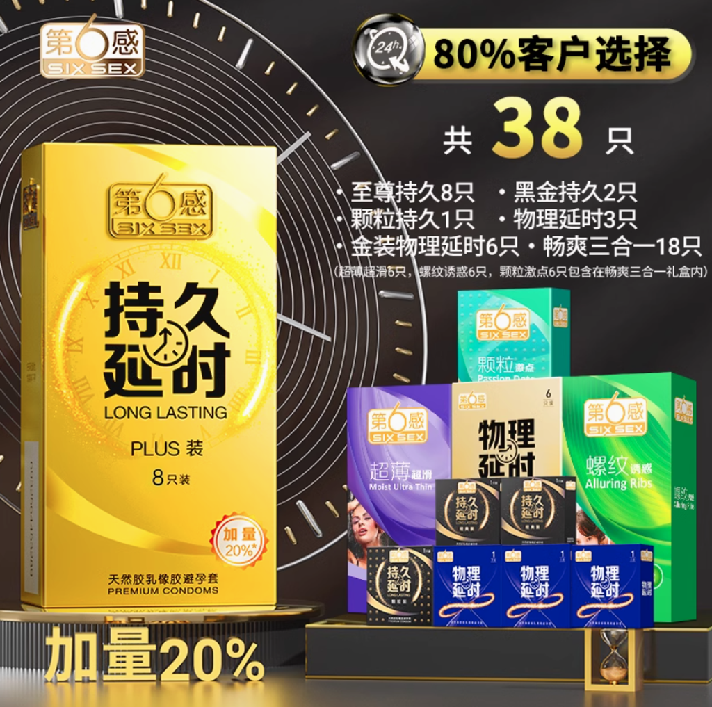 80%客戶選擇【38只】至尊持久8+黑金持久2+顆粒持久1+物理延時3+金裝物理延時6+暢爽三合一18
