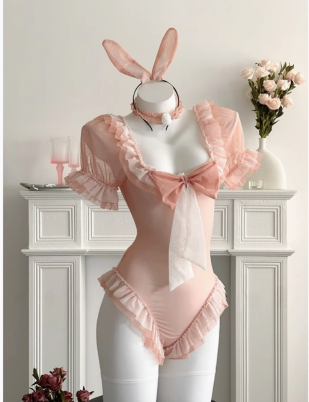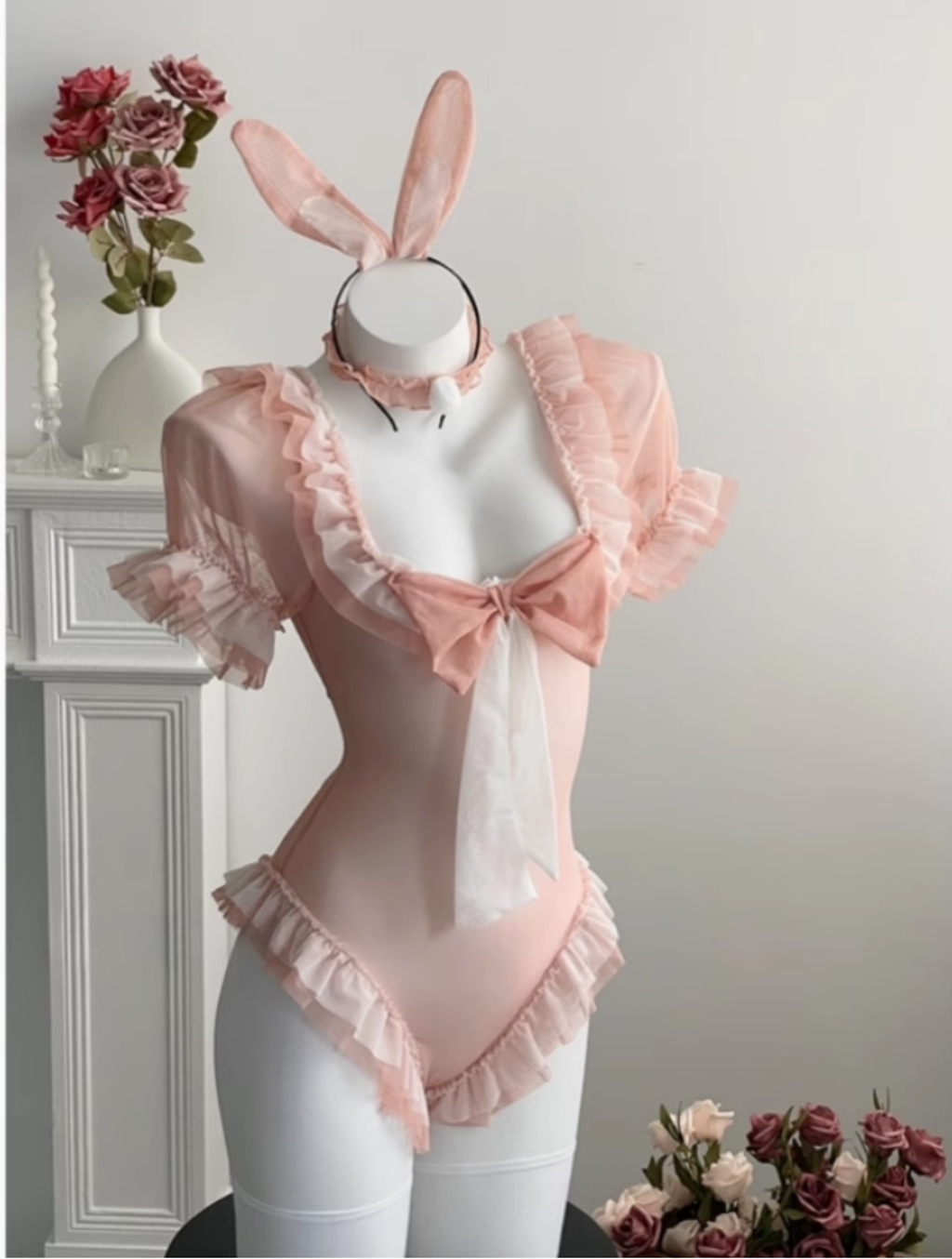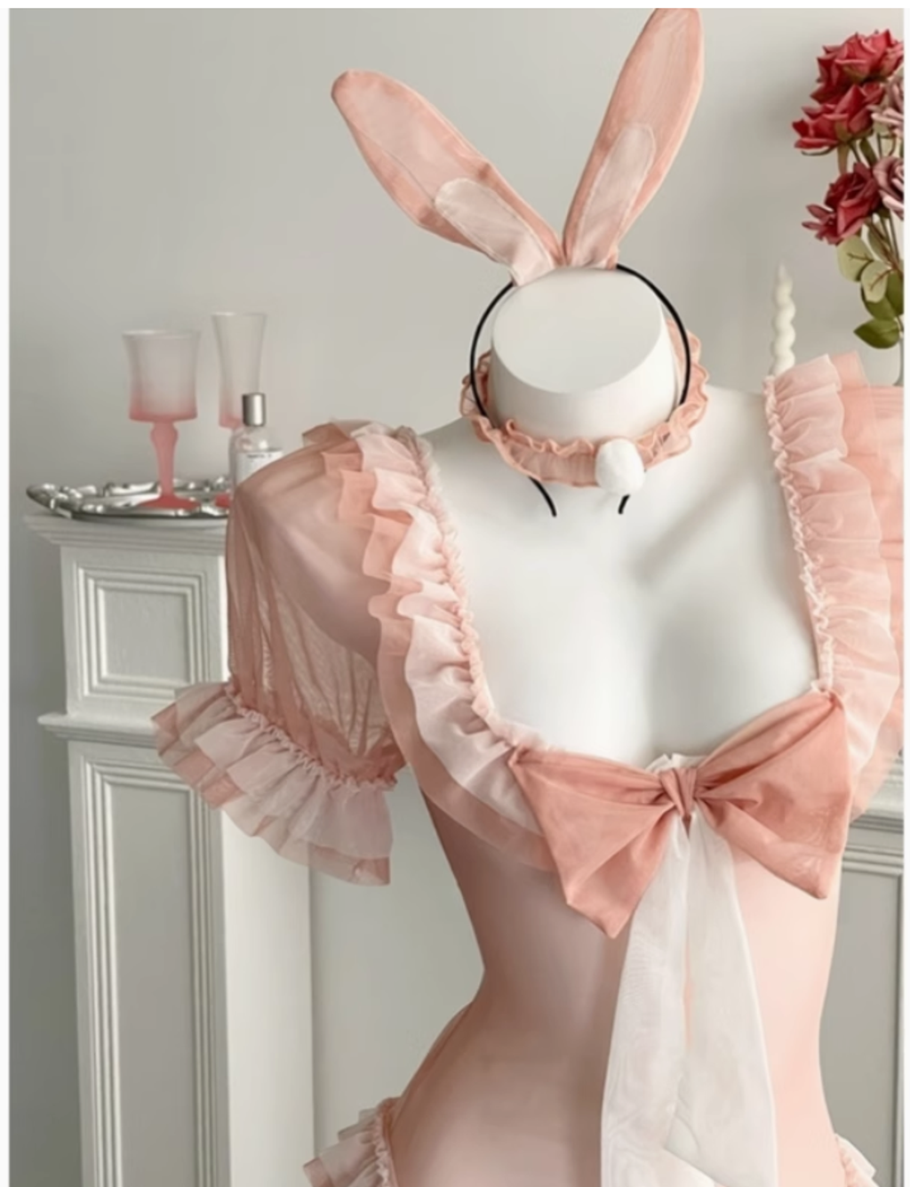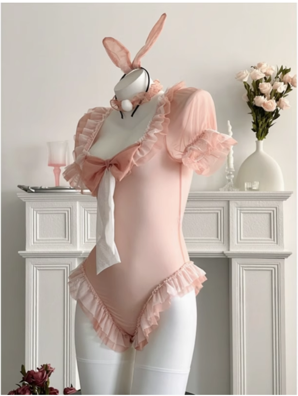 兔兔不可愛麽?甜美俏皮網紗蝴蝶結cos兔女郎蕾絲花邊甜粉色套裝