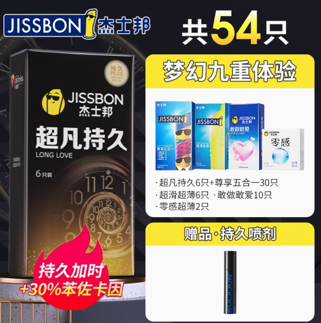 9重體驗【54只】超凡持久6+五合一30+敢愛10+超滑6+零感2+持久噴劑